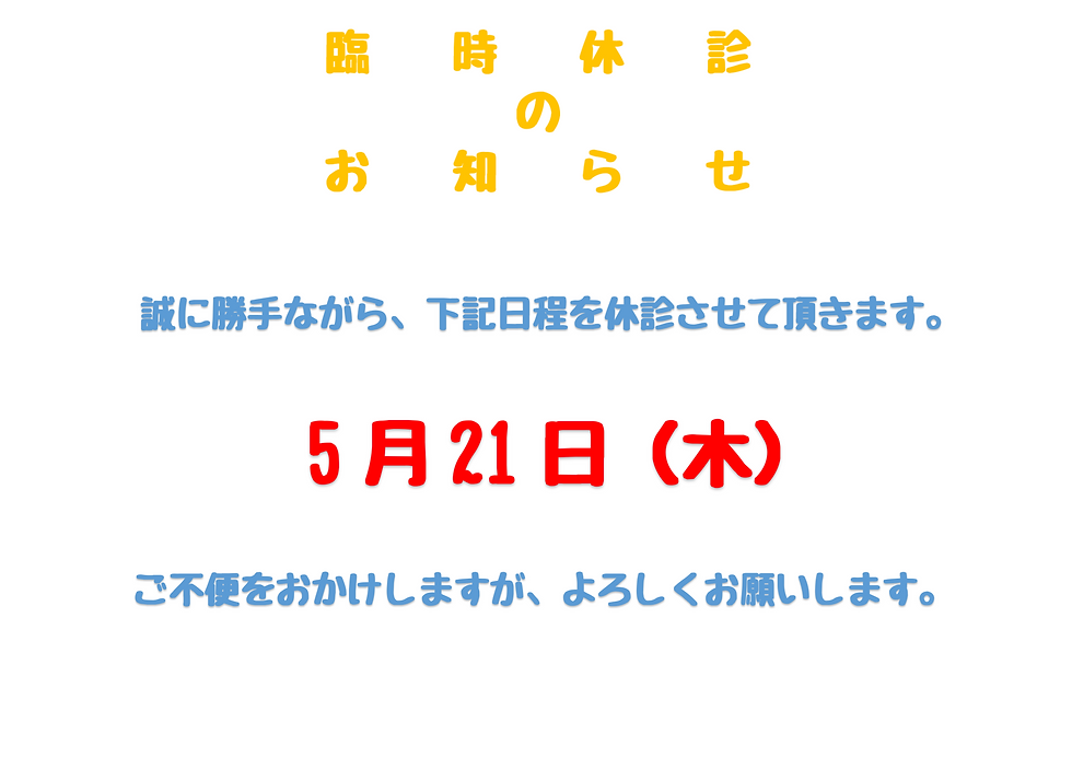 📍5月21日(木)は院長出張のため臨時休診となります。